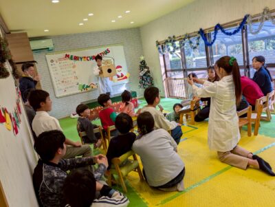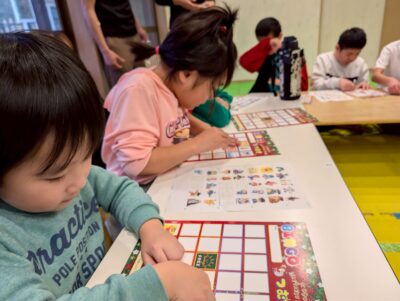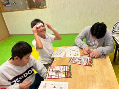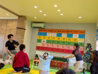 チームにわかれて、生き物や音楽、雑学やつむぎについてなど、色んなジャンルにわかれたクイズを出題しました。順番で代表者が、早押し対決!正解ポイントを多く獲得したチームの勝ちです。応援の声がたくさん聞こえる時間となりました